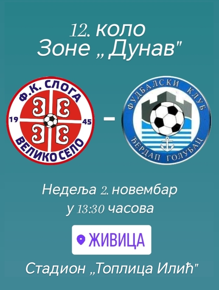Фудбалски клуб Ђердап из Голупца, који је освојио титулу јесењег шампиона, у 12. колу Зоне „Дунав“ гостује екипи Слоге 1945 из Великог Села. Утакмица се игра у недељу 2. новембра од 13:30 часова на стадиону ,,Топлица Илић“ у Живици.