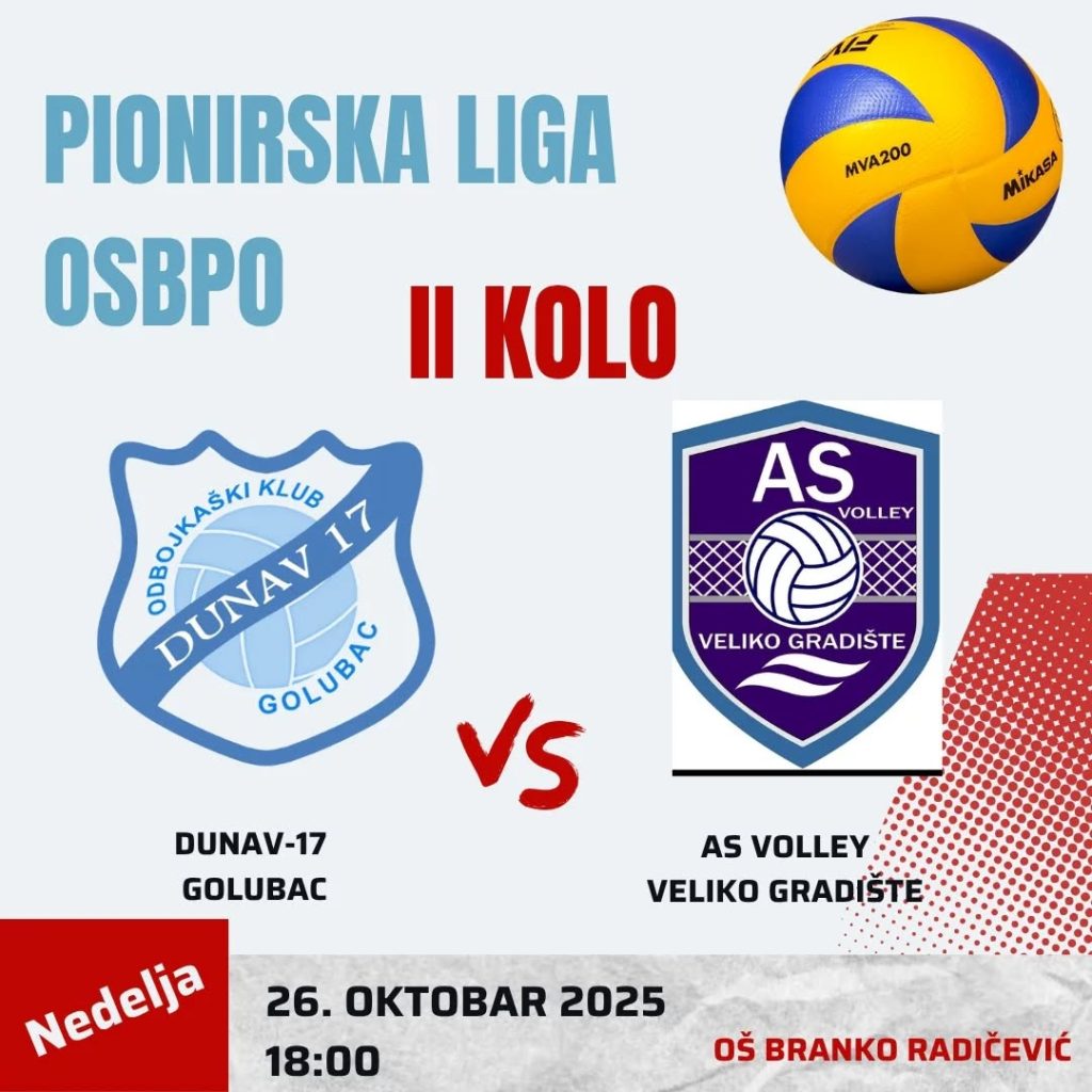У оквиру 2. кола Пионирске лиге Одбојкашког савеза браничевско- подунавског округа пионирке ОК Дунава-17 из Голупца играју код куће против вршњакиња Ас Волеја (As Volley) из Великог Градишта. Меч је заказан за недељу 26. октобар у 18 часова. Утакмица се игра у Спортској хали ОШ ,,Бранко Радићевић“ у Голупцу.