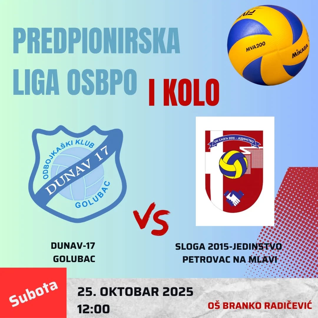 У оквиру 1. кола Предпионирске лиге Одбојкашког савеза браничевско- подунавског округа предпионирке ОК Дунава-17 из Голупца дочекују вршњакиње Слоге 2015- Јединства из Петровца на Млави. Утакмица се игра у суботу 25. октобра од 12 часова у Спортској хали ОШ ,,Бранко Радићевић“ у Голупцу.