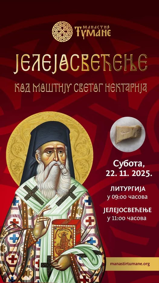 ,,Од када су мошти Светог Нектарија донете у манастир Тумане, његов празник се овде изузетно свечано обележава. Сваке године након Свете Литургије буде извршена Света тајна јелејосвећења за оне који болују и који пате, да их Господ молитвама Светог Нектарија исцели. Молимо све који желе да се сабету око светитеља тога дана да понесу по традицији уље, брашно и шећер у манастир за Свету тајну јелеосвећења. Добро сте дошли“, каже игуман манастира Тумане архимандрит Димитрије.
