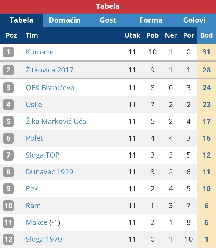 Кумане је освојило титулу јесењег шампиона УОФЛ Велико Градиште и Голубац. Житковица је друга, ОФК Браничево треће, Усије четврто, екипа Жика Марковић Уча пето, док шесто место заузима Полет из Бикиња. Ово је сјајна полусезона за екипе са подручја општине Голубац, с обзиром да су свих 5 екипа у горњој половини табеле. Велика борба водиће се на пролеће када се наставља првенство.